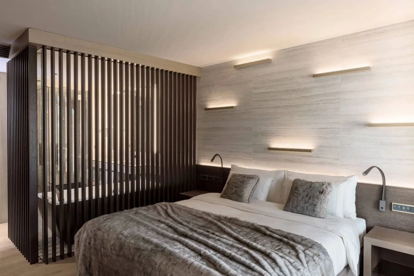 Der Schlafbereich besteht aus einem Hauptschlafzimmer mit begehbarem Kleiderschrank und Badezimmer sowie zwei Doppelzimmern, jedes mit eigenem Panorama-Badezimmer.